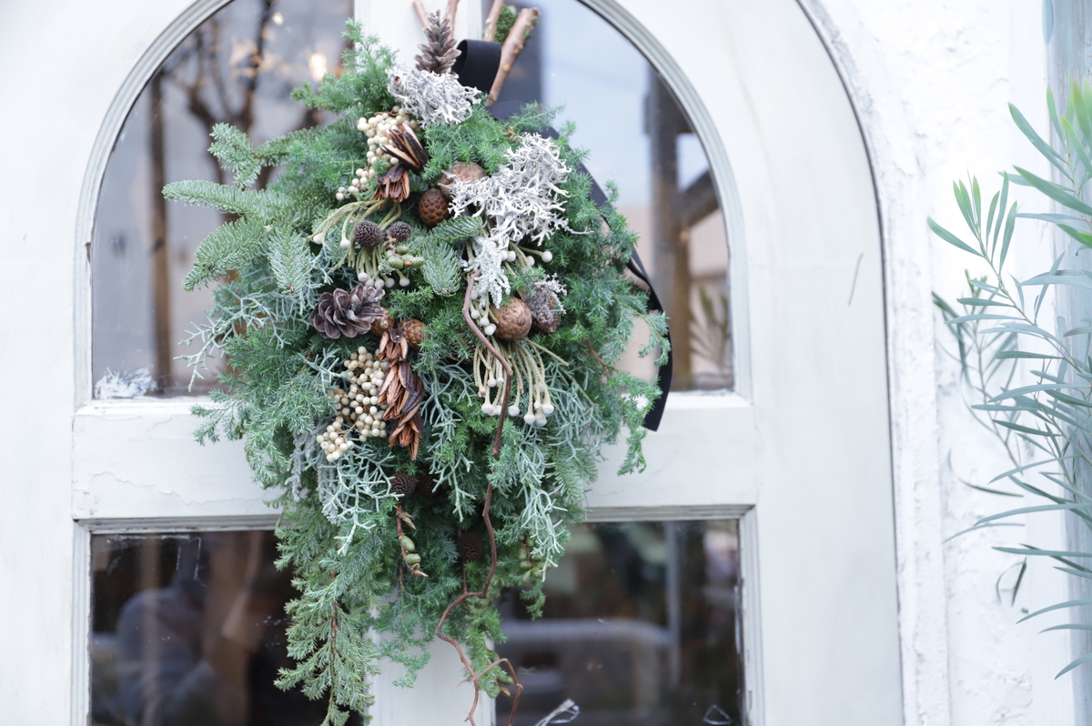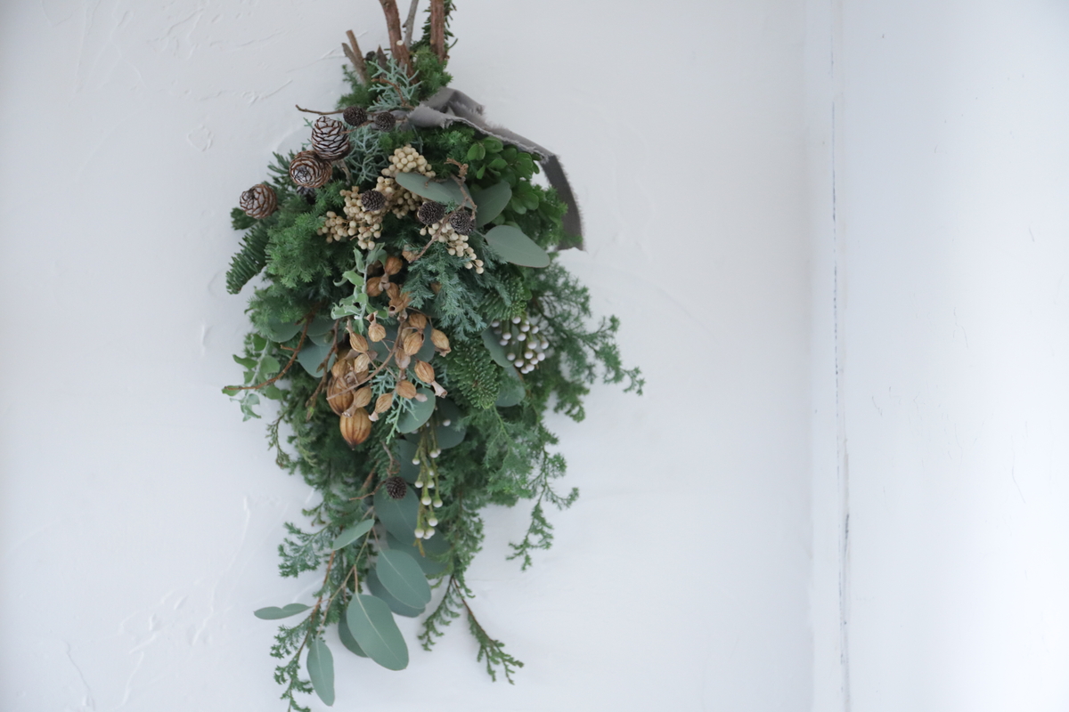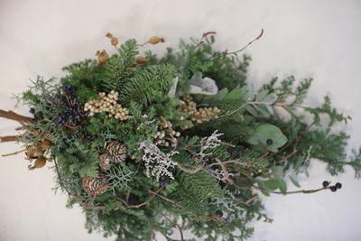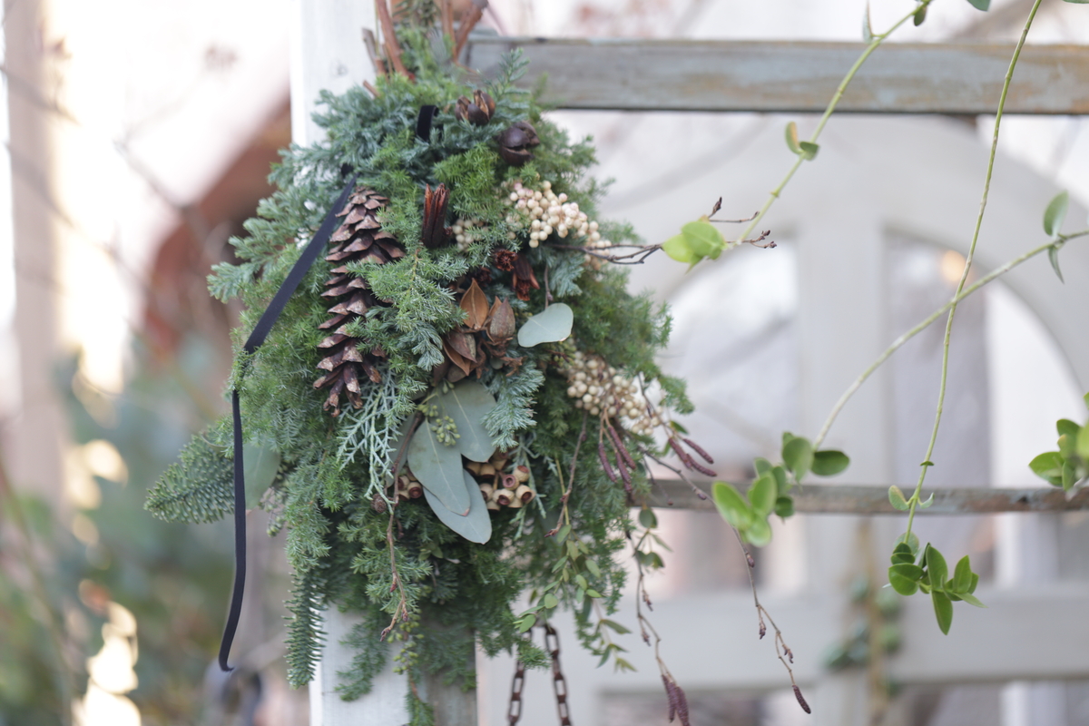 針葉樹をベースに木の実や葉などを束ねて制作します