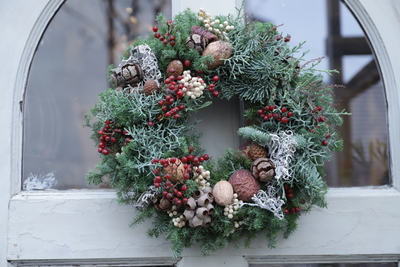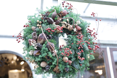 リースは針葉樹をベースに木の実や葉などを束ねて制作します