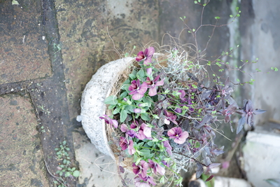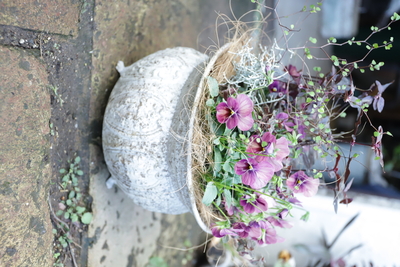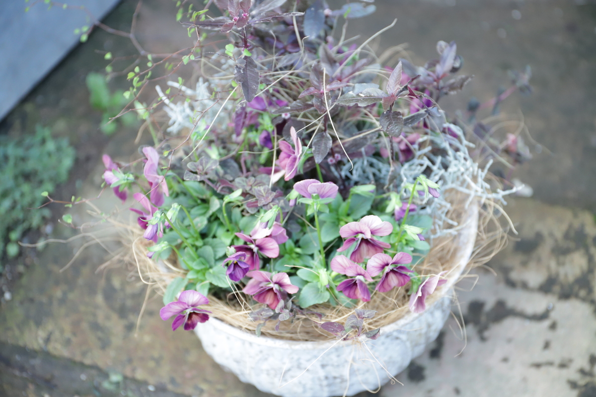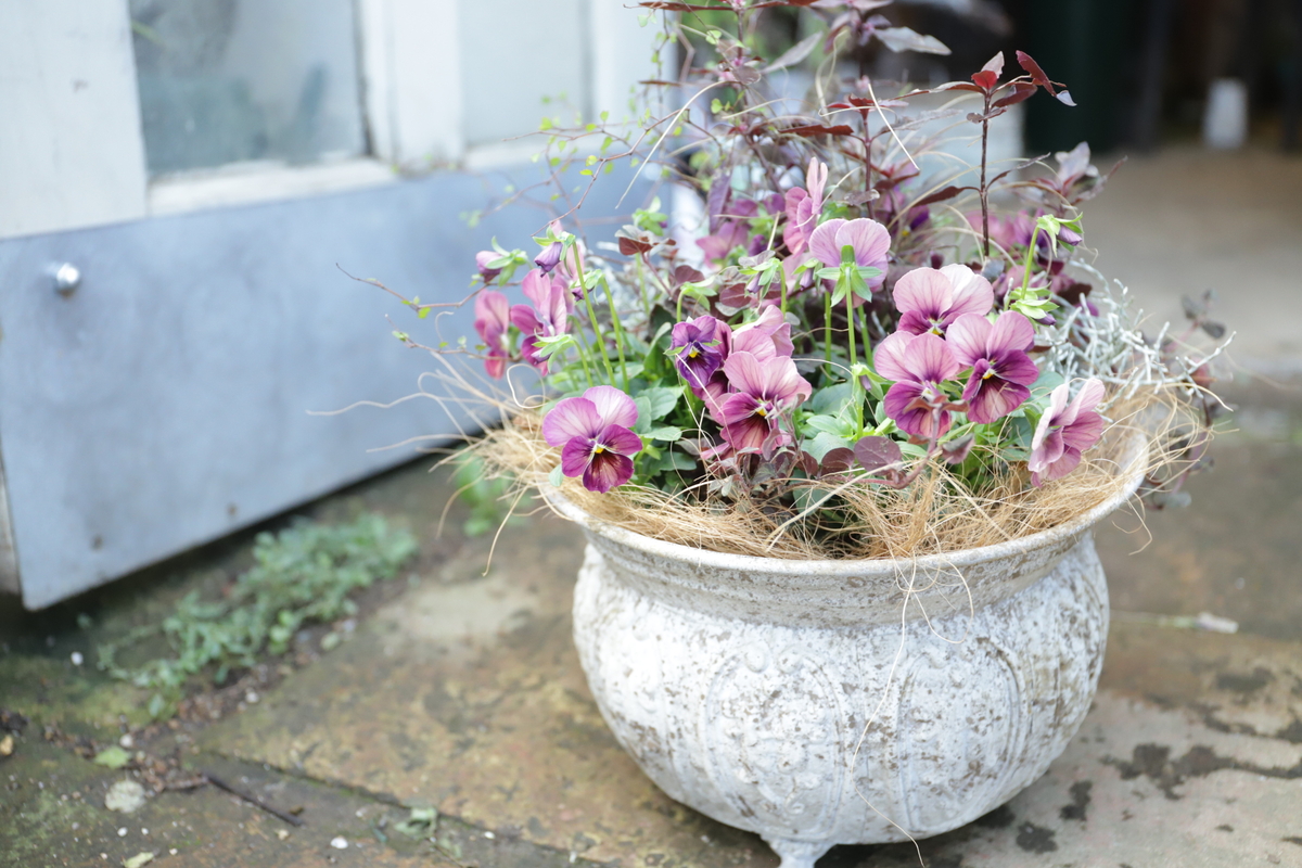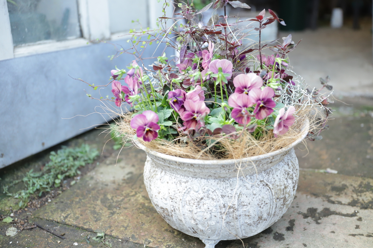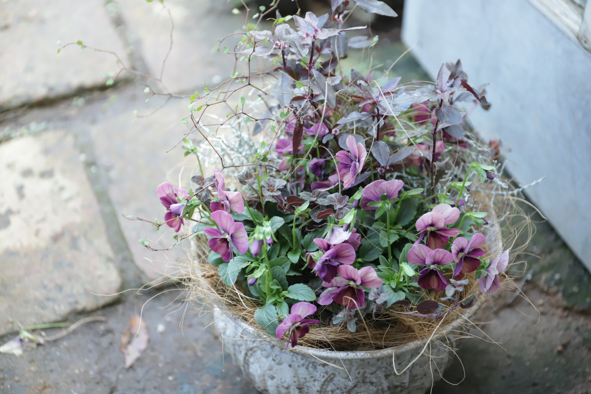 シックな色合いの鉢に渋めなビオラやシルバーリーフ