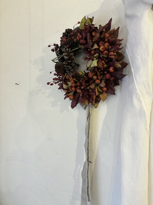 こちらは赤やオレンジの実が入って暖かみのあるリースです
