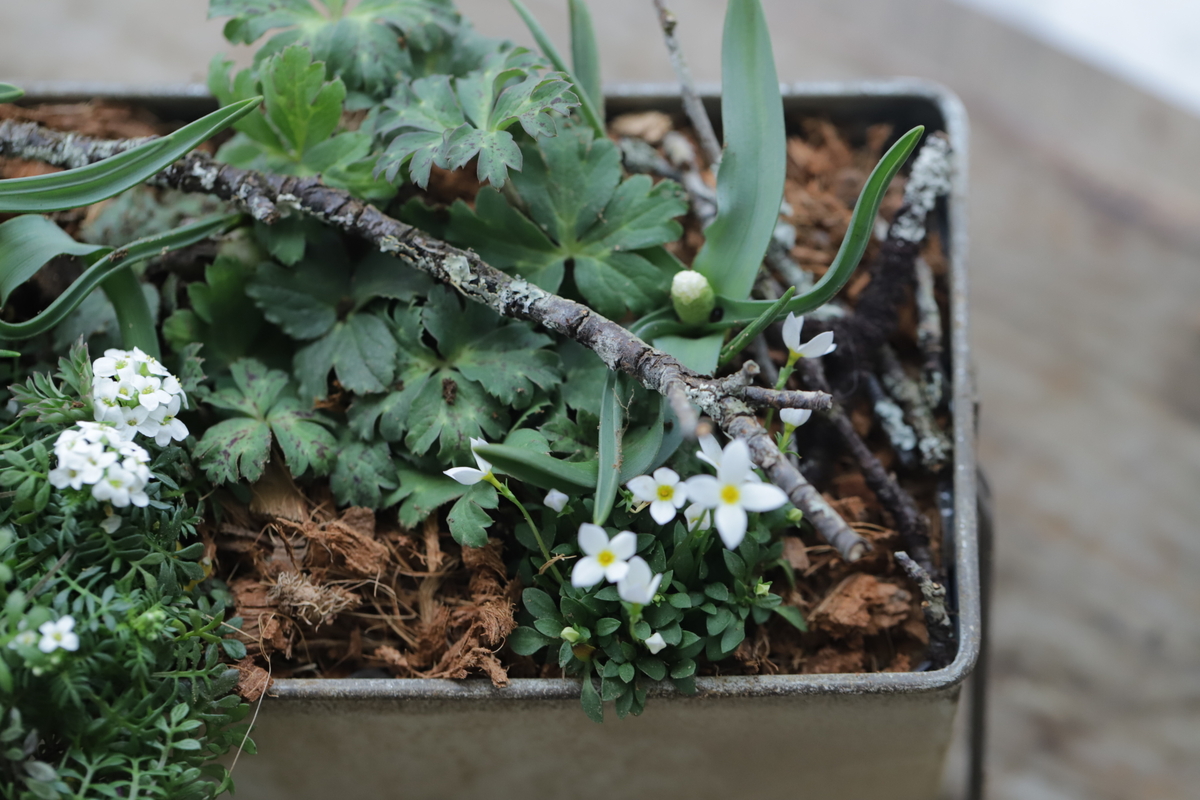 ムスカリやアネモネの原種など小さくて可憐なお花の寄せ植えです♪